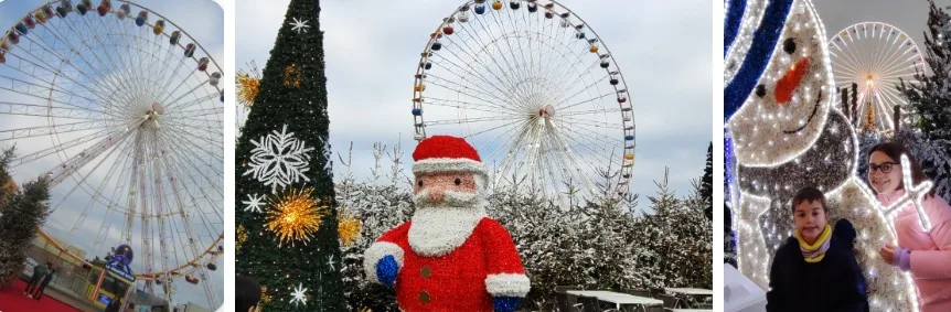 La gran noria se puede ver desde cualquier sitio de la Village de Noël, si os subís a ella se aprecia todo el parque, incluso vistas a la playa. Suele haber mucha fila, pero la espera tiene su recompensa.